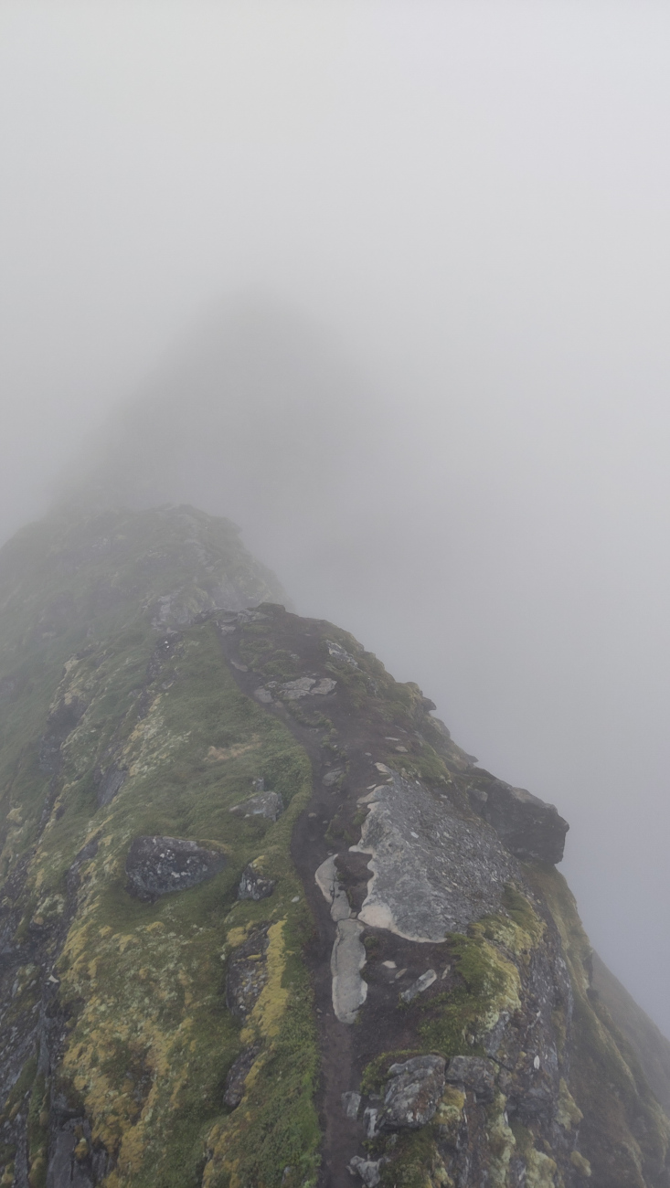 Je höher es geht, desto mehr verliert sich die Aussicht im Grau. Oben angekommen Wind und Wolken. Dennoch verweile ich etwas. Schaue anderen Wanderern zu, wie sie den Grat zum nächsten Gipfel gehen. Oft hört man später nur noch die Stimmen von ihnen.